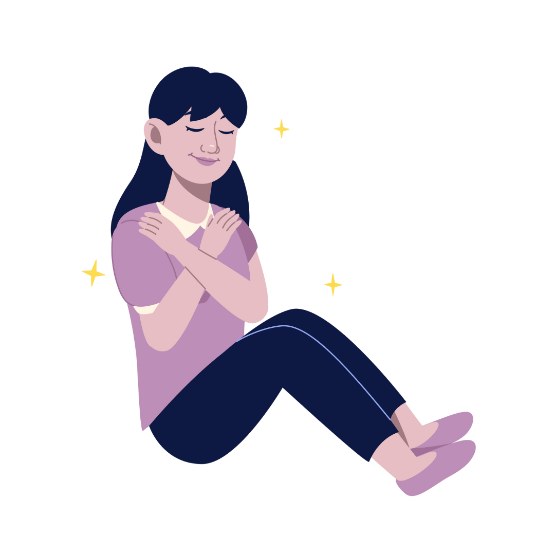 Illustration of a woman sitting cross-legged, eyes closed, smiling, and hugging themselves, with yellow sparkles around. Self-love.