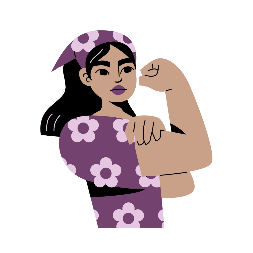 Illustration of a strong, empowered woman flexing their bicep, wearing a purple headscarf and top with floral patterns.